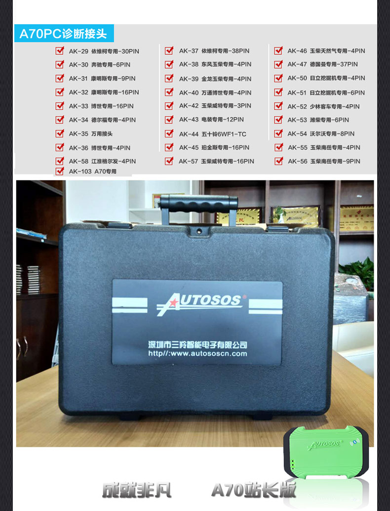 柴油測神A70站長版解碼器是深圳三羚公司根據市場需求為社會維修廠提供的一款基于技術服務支持的綜合性汽車電腦診斷儀,也是一款綜合性工程機械診斷儀,支持手機版診斷儀,擁有國六DPF高溫再生和SCR后處理試驗臺功能,旨在解決商用車后市場技術需要提升的維修廠,深圳三羚公司汽車電腦診斷儀十五年堅持自主研發,先后榮獲慧聰網商用車十佳售后服務企業,內燃機行業協會授予的商用車售后服務貢獻獎,從第一臺手持式A30C柴油車解碼器到測神30PC柴油車解碼器再到測神A60PC柴油車解碼器,到測神A70PC站長版柴油解碼器,一直以檢測精準,測試全面,技術精湛,服務至上的經營理念深受廣大維修人員推崇,迄今為止有三千多家柴油測神A70站長版解碼器用戶加盟三羚服務站,成為當地區域汽修龍頭中堅力量,因其過硬的技術讓主機廠家主動為其設立服務站,為國家汽車后市場努力奉獻。